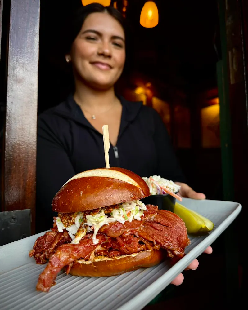 Thinly sliced hot and juicy corned beef, Swiss, whole grain mustard, and pickles pressed and grilled on fresh rolls.